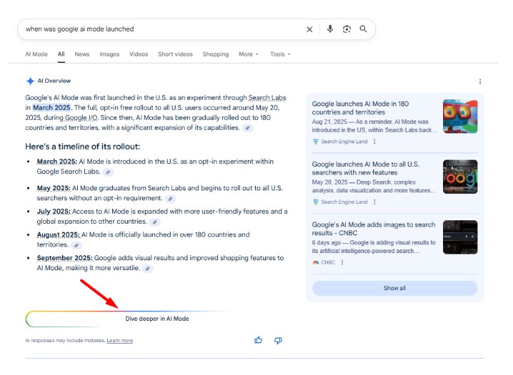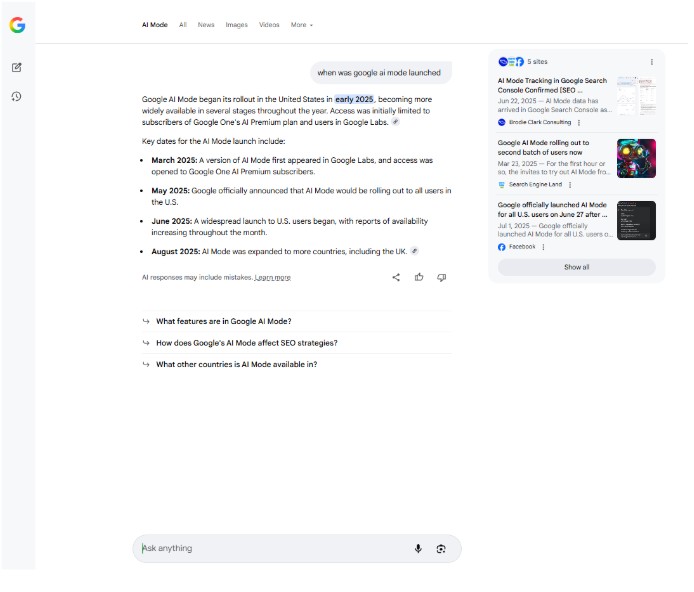 In June of 2025 Google rolled out AI Mode to all users in the United States.