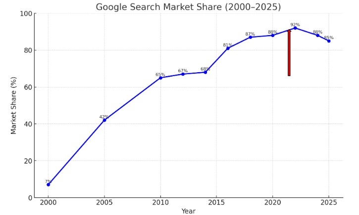 - Google’s US market dominance peaked in February 2023 at 93.37%.