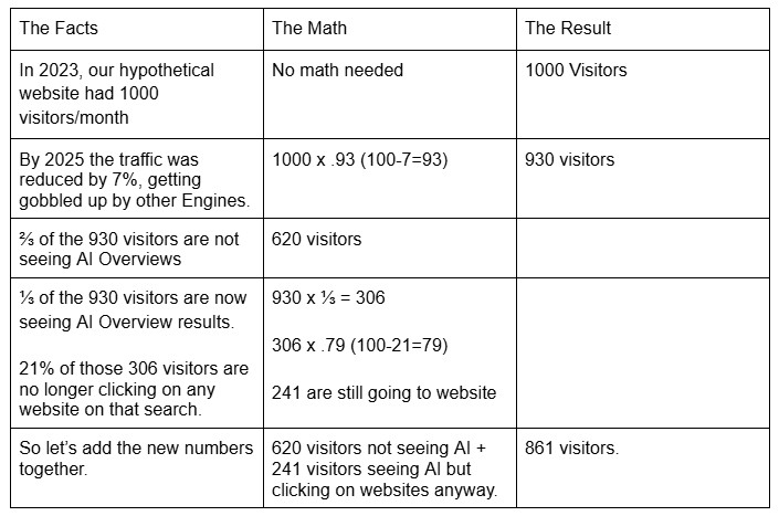 Let’s assume for a second the traffic drop on your website is linear with the market share of Google. That means off the top, your search traffic since 2023 has reduced by roughly 7%. Now let’s assume that 1/3 of your overall traffic to your website is currently generating AI Overviews And that traffic is reduced by 21%.