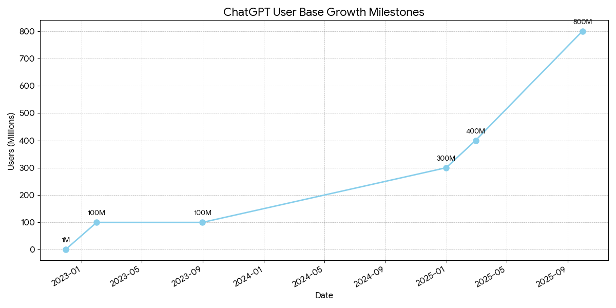In 2015 several individuals including Sam Altman and Elon Musk founded a company called OpenAI. The company was designed to be a research organization dedicated to developing artificial intelligence safely and for the benefit of humankind. Its early goals were to advance these AI capabilities while ensuring transparency and ethics. ChatGPT emerged from this research as part of OpenAI’s Generative Pre-trained Transformer series which applied deep learning and transformer architectures to generate coherent text. The first version of ChatGPT launched on November 30, 2022. Below is a graph showcasing the growth of its user base.